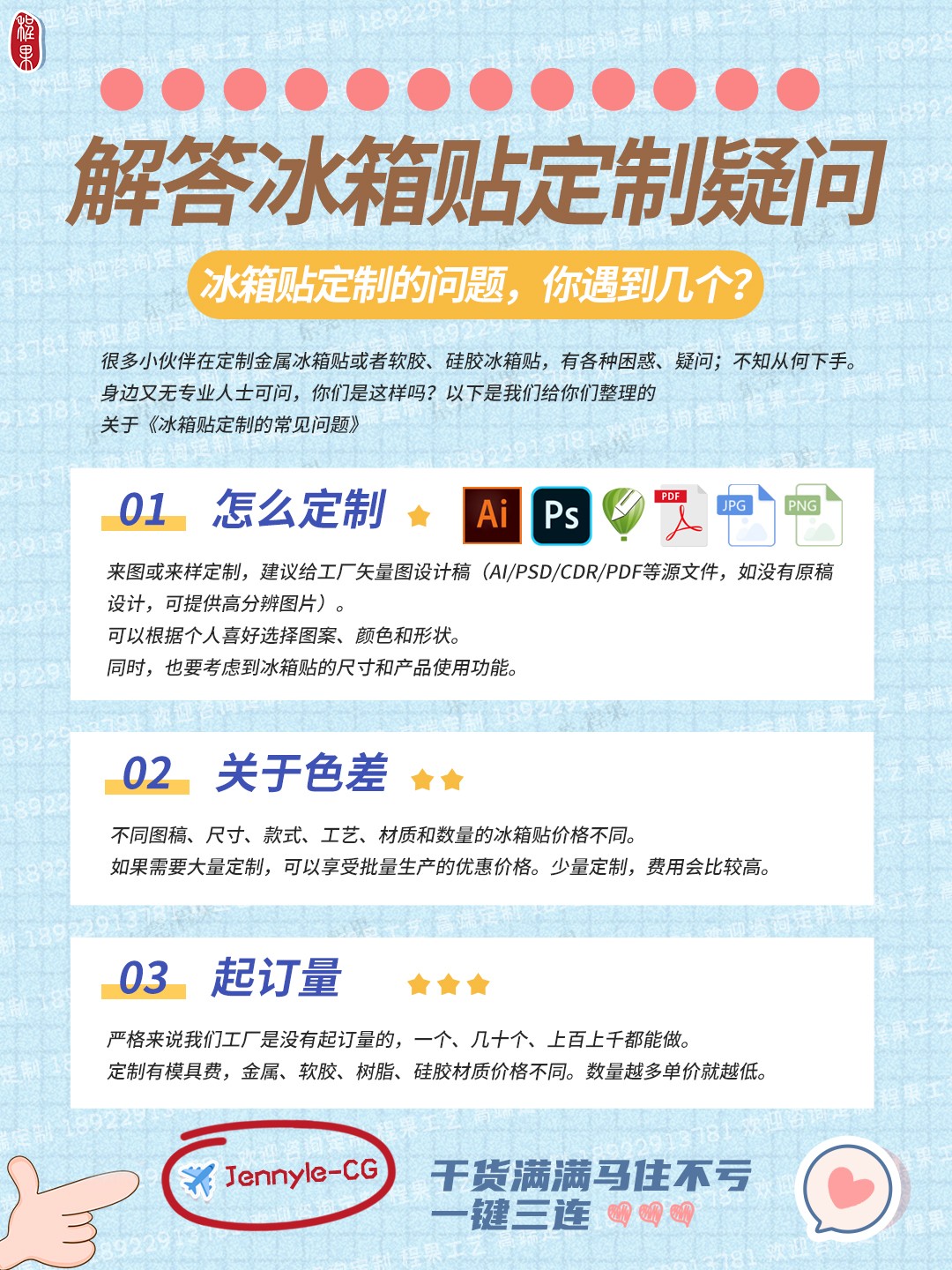 总之,在定制冰箱贴时,需要注意产品的材质、外观、功能、数量、价格、品质保证以及吸附力等方面。同时,还要考虑使用场景、个性化需求、定制周期、厂家资质、支付方式和产品验收等方面的问题。只有这样,才能定制到符合自己需求的优质冰箱贴。